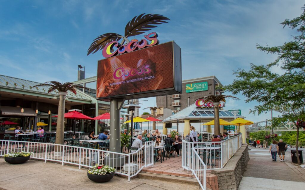 For lunch, dinner, or a casual evening out, Coco’s Wood Fire Pizza and Grill is right next door to the hotel. Known for its wood-fired pizza, hearty entrées, and relaxed patio atmosphere, Coco’s is a favourite with families and groups. In the summer months, the open-air terrace offers the perfect spot to enjoy a meal outdoors just steps from your guest room.